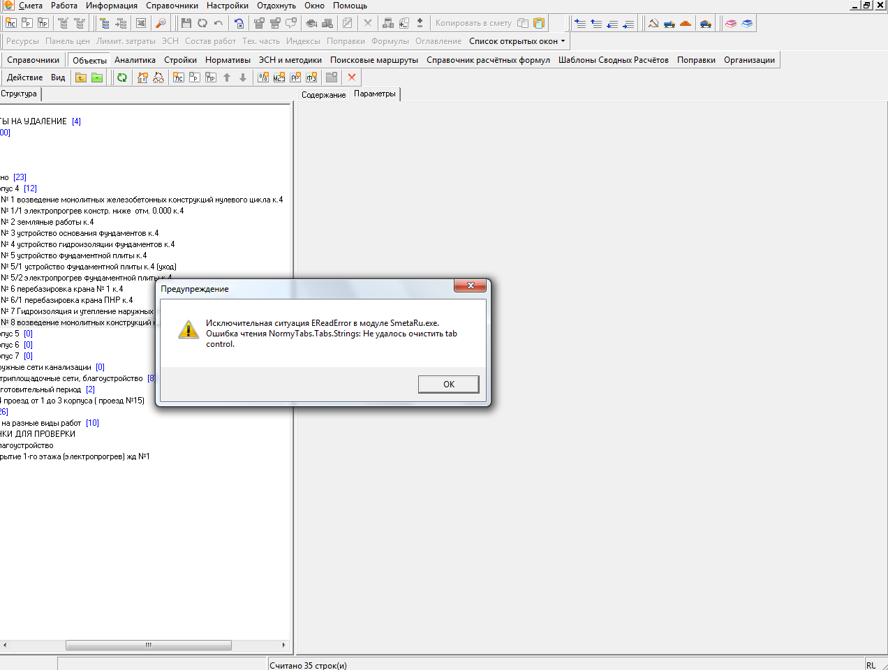 ТСН 2001 одиннадцати графка. На втором снимке когда пытаюсь войти в параметры объекта или стройки (свойства). Еще есть третья и четвертая ошибка 3) это постоянное исчезновение оглавления, 4) это что то происходит со вкладками состав работ и другими в менеджере при выборе состава работ пропадают остальные вкладки (полн. наим., ресурсы). Патч стоит 8.0.0.15.