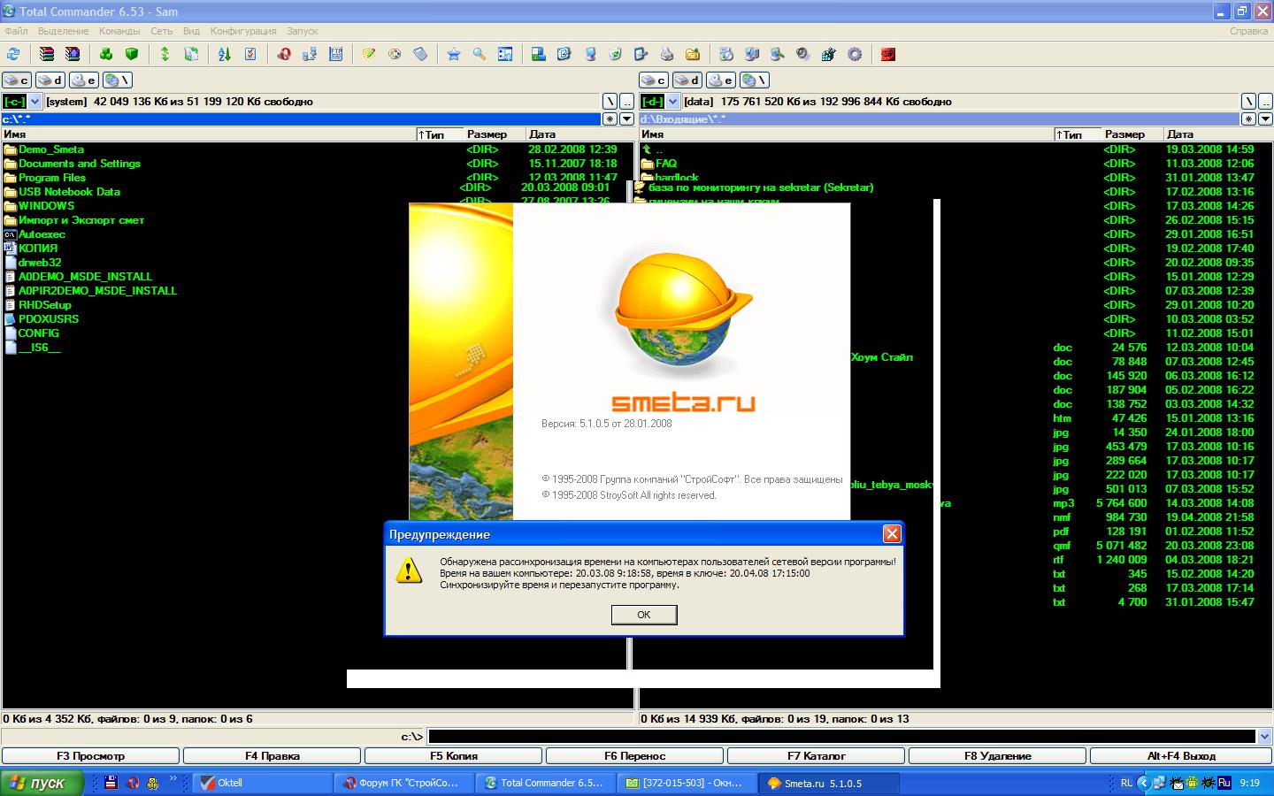Работаем по лок.сети. Сервер БД и сам ключ (на 5 раб.мест) установлен на одной машине (Win2000 server). Время системное на этой машине текущее. Клиент на сервере запускается без проблем. Но вот клиенты которые находятся удаленно по сети начинают конфликтовать, т.е. как видно на скрине происходит разногласие между временем удаленного клиента и времени, которое на ключе...