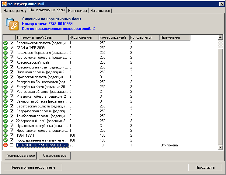 Доступ к базе ТСН предоставлен. Есть ограничение по ее применению. База доступна только первым 10-ти пользователям. Вы можете воспользоваться встроенным в программу чатом, для того чтобы попросить кого-то из пользователей программы освободить лицензию на ТСН. Ограничения касаются только базы ТСН.
